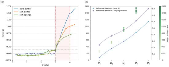 The output results of the fuzzy logic module are presented in the line graph in Figure 5b, including the maximum reference force and the maximum grasping reference stiffness coefficient, which are represented by blue squares and purple hexagons, respectively. It is important to note that the grasping stiffness coefficient referred to here is the stiffness coefficient parameter used in the impedance control law. In this case, the fuzzy logic module outputs the maximum set values for the reference force and reference grasping stiffness coefficient. The output range for the maximum reference force is limited to 1–4 N, and the output range for the maximum grasping stiffness coefficient is limited to 1–5. Therefore, for very hard objects, the fuzzy logic module outputs the maximum reference force of 4 N and the maximum grasping stiffness coefficient of 5. Besides, it can be observed that for objects with higher stiffness, both the maximum reference force and the maximum reference grasping stiffness coefficient are higher. Conversely, for objects with lower stiffness, both the maximum reference force and the maximum reference grasping stiffness coefficient are lower. Furthermore, it is observed that the trends in the maximum reference force and the maximum reference grasping stiffness coefficient closely follow the trends in the stiffness of the objects. This finding essentially confirms the effectiveness of the object stiffness identification method based on the fuzzy logic module.