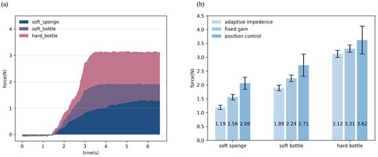 The contact force data collected during experiments conducted in adaptive impedance mode is illustrated in Figure 6a. As illustrated in Figure 6a, it can be observed that as the object transitions from soft to hard, the contact force increases progressively from the initial grasping phase until stabilization. Additionally, the rate at which the contact force changes becomes faster with increasing object stiffness. The experimental result of different control methods for the dexterous robotic hand is illustrated in Figure 6b and Table 2. From Figure 6b, it can be observed that the contact force exerted on the objects of different stiffness levels varies significantly depending on the control method used. The contact force of position control is the highest among the three control methods. This is likely due to the rigid nature of position control, which does not account for the compliance of the objects, leading to higher forces being applied. The contact force of fixed gain impedance control is moderate, indicating that impedance control provides a balance between precision and compliance, allowing for safer interaction with the objects. The contact force of adaptive impedance control is the lowest among the three control modes. This is a significant advantage of the adaptive impedance control proposed in this paper, as it dynamically adjusts the stiffness coefficient and force profiles based on the object’s stiffness, resulting in minimal force application and safer handling of the objects. Simultaneously, it can be observed that the standard deviation of the contact force under position control is much larger compared to impedance control modes. And the standard deviations of the contact forces for the two impedance control modes are relatively similar, indicating similar stability and consistency. This is because, under position control mode, even small changes in the desired position can lead to substantial variations in the contact force. The experimental results presented above effectively validate the effectiveness of the adaptive impedance control method proposed in this paper for compliantly grasping objects with different stiffness levels.