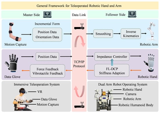 To validate the effectiveness of the proposed compliant hand teleoperation method, we applied it to actual teleoperation scenarios and conducted experiments. The general framework for teleoperated robotic hand and arm is shown in Figure 7. The experimental platform utilized in teleoperation experiments is the immersive humanoid dual-arm dexterous robot previously developed by our laboratory team [41]. The data glove and motion capture use Senseglove Nova 2 and Noitom Perception Neuron Pro on the master side, respectively. The dexterous robotic hand and the robotic arm use Inspire Hand and Rokae xMate ER7 Pro on the follower side, respectively. The data communication between the motion capture system and the robotic arm is also achieved via TCP/IP protocol over a local area network. The motion capture data is divided into position and orientation components, which are transmitted in incremental form for action mapping. After receiving the pose data, the robotic arm uses inverse kinematics to calculate the appropriate joint angles to move. The inverse kinematics adopts the relaxed-ik method [42]. This method can avoid kinematics singularity, discontinuity of joint space, self-collision avoidance and so on while ensuring the end-effector pose matching.