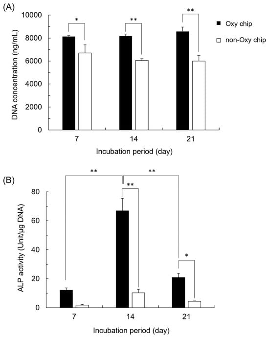 3.2. DNA Concentration and ALP Activity of iPSCs Cultured on Oxy Chip and Non-Oxy Chip