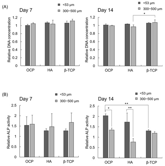 3.4. DNA Concentration and ALP Activity of iPSCs Cultured with Various CaP Granules
