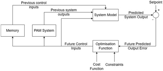 MPC uses a model of the system as well as prior knowledge of the input sequence to predict the movement of the actuator in advance for a given future time period. This allows for accurate control of nonlinear systems for any input sequence and is therefore usable for various applications. MPC also has the option of constraining many aspects of the control sequence, including minimum and maximum control values for both the control output and the predicted control output, as well as minimum and maximum values for the rate of change of control values. However, the necessity of a mathematical model of the system can cause issues in development, especially for a complex system such as a PAM, as these models often include simplifications and assumptions resulting in inaccuracies. The controller also requires that the entire input sequence be known beforehand, and the predictive nature prevents it from being used in modes other than passive movement, such as resistive training in rehabilitation. The structure of the MPC algorithm is shown in Figure 1.