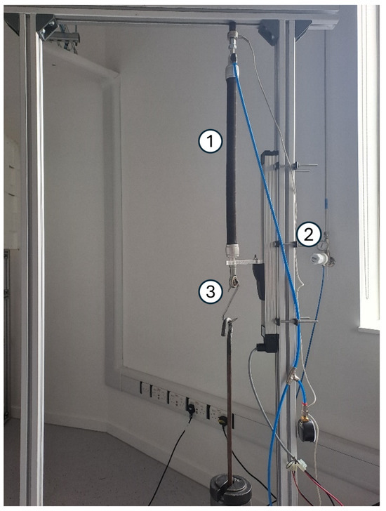 The experimental setup, showing the FESTO DMSP-20-400N PAM (1), FESTO MLO-POT-300-TLF displacement encoder (2), and external load attachment (3).