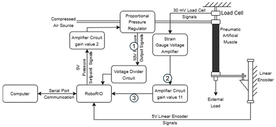 The system designed for testing the developed controllers includes a single PAM setup in a vertical position, with the fixed end connected to a frame and the unaffixed end connected to a linear encoder as the output measure of these experiments is the actuator’s displacement. Pressure input and output to the PAM is controlled by a proportional pressure regulator, the input voltage of which is the controlled variable of the system. Figure 2 shows a picture of the PAM setup with the encoder sensor and external weight attachment.