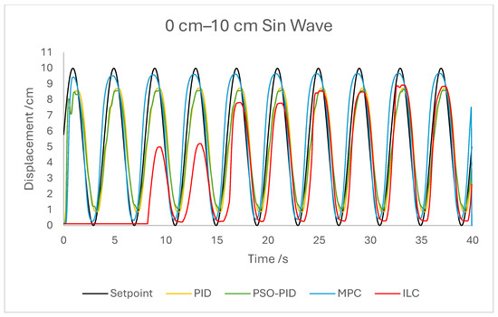 Graph showing the setpoint waveform and PAM displacement under each control scheme during the 0 cm–10 cm sin wave experiment.