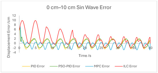 Graph showing displacement error of the PAM under each control scheme during the 0 cm–10 cm sin wave experiment.