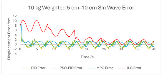 Graph showing displacement error of the PAM under each control scheme during the 10 kg-weighted 5 cm–10 cm sin wave experiment.