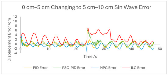 Graph showing displacement error of the PAM under each control scheme during the 0 cm–5 cm changing to 5 cm–10 cm sin wave experiment.