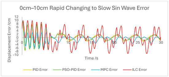 Graph showing displacement error of the PAM under each control scheme during the rapid changing to slow motion 0 cm–10 cm sin wave experiment.