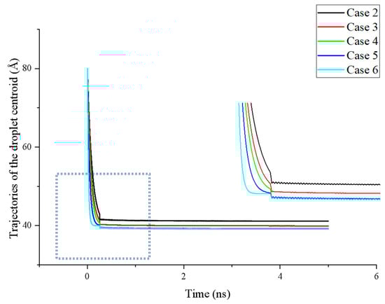 t < 0.5 ns), the droplet in all cases rapidly moves downward. This effect is particularly pronounced when the smooth substrate on the surface exhibits stronger hydrophilicity, allowing the simulation system to reach a dynamic equilibrium state more quickly. Due to the contrasting wettability between the etched and smooth areas of the surface at this stage, the centroid position of the droplet exhibits noticeable fluctuations. The magnitude of these fluctuations increases with greater differences in the wettability. Conversely, when the wettability of the surface areas is more similar (e.g., Case 3 and Case 4), the fluctuations in the droplet’s centroid position are largely reduced.