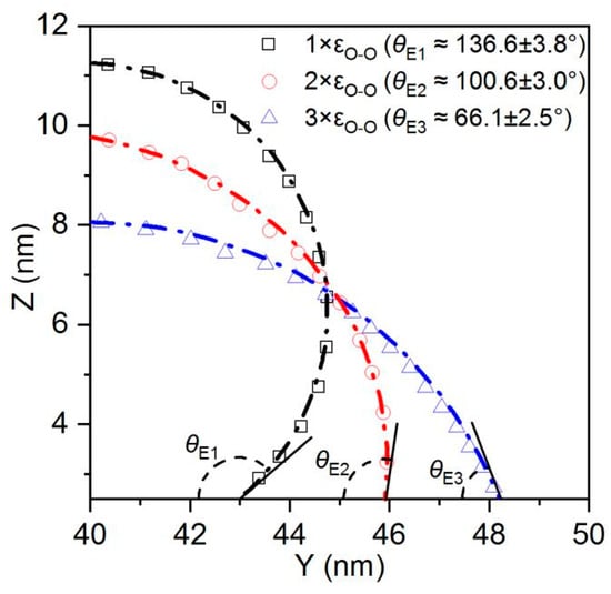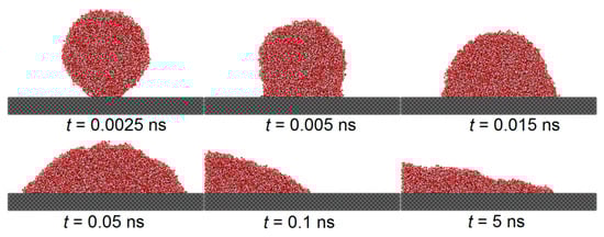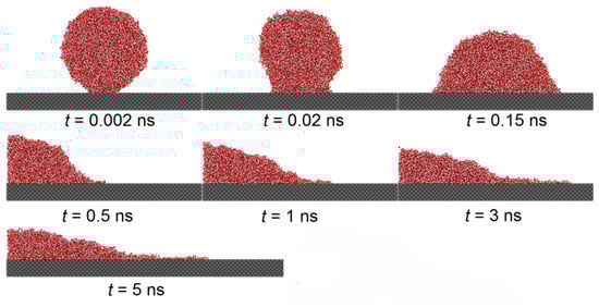 From both the figures, it is found that during the initial phase of droplet spreading, the water molecules near the substrate below the droplet are more easily attracted to the solid atoms and, thus, they move down faster to the substrate surface and form several thick layers of water molecules. At this moment in time, the shape of the droplet is not an ideal spherical crown, and the water molecular layer on the basement surface and the main droplet above it are connected by a sunken “liquid bridge”, which is more obvious when the  is large. With the spread of the droplet, the sunken “liquid bridge” gradually disappears, and the main droplet interacts with the water molecular layer on the substrate surface, and there is no obvious distinction between them.
