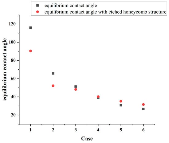 Figure 8 identifies that the increasing hydrophilicity of the smooth area transforms the etched area from being relatively more hydrophilic to being relatively more hydrophobic, thereby altering the overall surface wettability. In Cases 1, 2, and 3, the equilibrium contact angle of the surface becomes smaller than that of the original, indicating an enhancement in the hydrophilicity. Conversely, in Cases 4, 5, and 6, the etched area is more hydrophobic than the original smooth surface, and the equilibrium contact angle increases, leading to a reduction in the overall hydrophobicity. In Case 1, the original equilibrium contact angle of the surface is 116°, while it decreases by 25.56 to 90.4° after the honeycomb structure is etched onto the surface, while in Case 6, the equilibrium contact angle increases from 26° to 31.51°. The simulation results are shown in