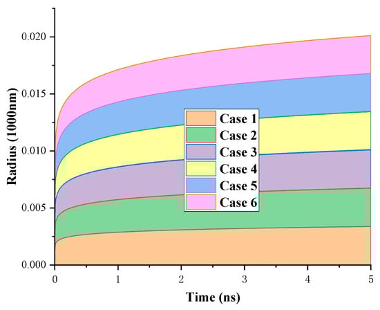 Figure 9, the time evolutions of the droplet spreading radius in different conditions are presented. Overall, the final spreading radius depends on the overall wettability of the surface; the greater the wettability, the larger the final spreading radius.