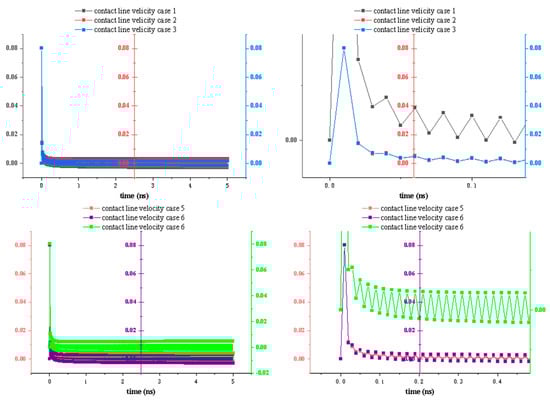Figure 10 illustrates the time evolutions of the dynamic three-phase contact line velocity for Cases 1–6. Based on these profiles, we observe that the droplet initially establishes contact with the surface very rapidly, resulting in a high contact line velocity, which then decreases sharply. According to droplet spreading theory, water molecules first need to establish contact with the surface; subsequently, under the influence of solid–liquid interactions, they spread out across the substrate. During this initial contact phase, the effect of wettability on the contact line velocity is relatively small. However, once contact is established, the droplet’s further spreading behavior becomes closely linked to the substrate’s wettability.