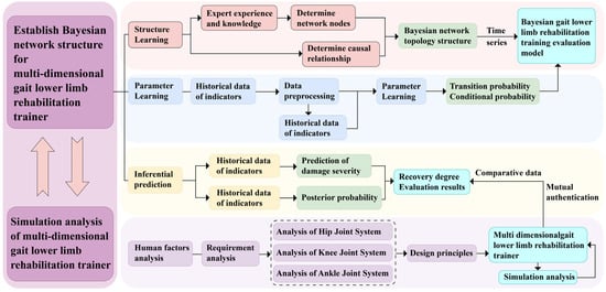 Traditional lower limb rehabilitation training device designs often emphasize the stability of the mechanical structure and the accuracy of the motion trajectory []. Traditional designs often neglect patients’ personalized rehabilitation needs and psychological experiences during the training process, as well as fail to fully consider the crucial role of advanced technologies, such as Bayesian networks, in optimizing rehabilitation training programs []. In fact, patients’ rehabilitation processes, training dynamics, and training effects are deeply influenced by the design of rehabilitation training devices. The design of parallel multidimensional gait lower limb rehabilitation training devices is actually a complex systems engineering project that spans multiple disciplines, including rehabilitation medicine, biomechanics, ergonomics, and Bayesian networks. It not only requires designers to understand patients’ rehabilitation needs and psychological states deeply but also to precisely grasp the scientificity and personalization of training programs, that is, by utilizing the principles of Bayesian networks through intelligent adjustment of training parameters and flexible switching of training modes, effectively guide patients to participate in training, optimize training effects, reduce physical and mental burdens, and thereby comprehensively enhance the level and depth of rehabilitation training [].