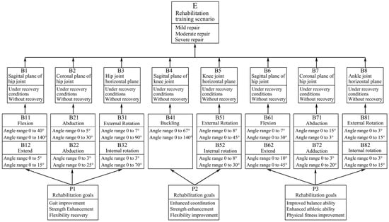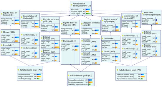 Observation node variable set = {flexion (hip) (B11), extension (hip) (B12), abduction (hip) (B21), adduction (hip) (B22), external rotation (hip) (B31), internal rotation (hip) (B32), flexion (knee) (B41), external rotation (knee) (B51), internal rotation (knee) (B52), flexion (ankle) (B61), extension (ankle) (B62), abduction (ankle) (B71), adduction (ankle) (B72), external rotation (ankle) (B81), Internal rotation (ankle) (B82)}, and rehabilitation goals (P1, P2) = {rehabilitation goal (P1) → gait improvement, strength enhancement, flexibility recovery; rehabilitation goal (P2) → coordination enhancement, strength increase, flexibility improvement; rehabilitation goal (ankle) (P3) → balance improvement, motor ability enhancement, physical fitness improvement}. These observation nodes represent specific joint movements and rehabilitation goals, which are data that can be obtained through actual measurements or assessments and are used to infer the states of intermediate nodes and target nodes.