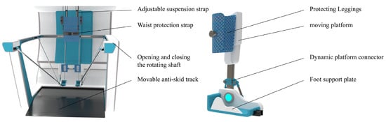 The lower limb rehabilitation robot consists of four parts: a back support device, a trolley support frame, a rehabilitation actuator, and wearable rehabilitation shoes. The mechanical model of the device is shown in Figure 4.