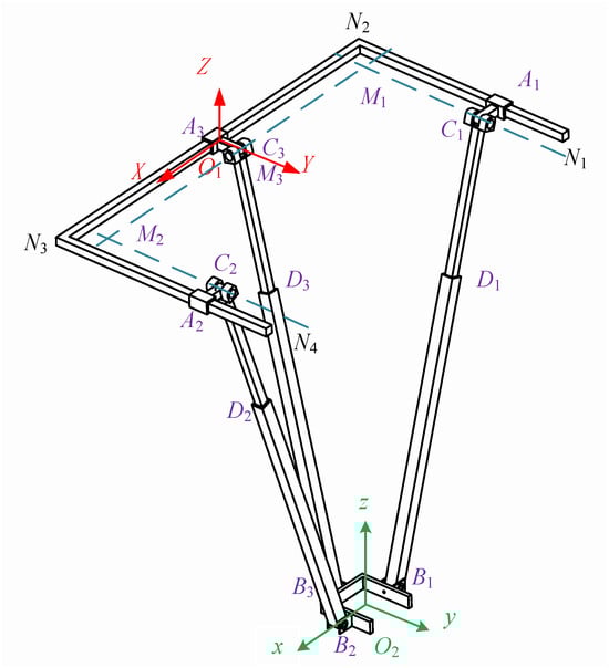 Before solving for the inverse kinematics, it is necessary to establish a coordinate system. Firstly, a base coordinate system fixed to the fixed platform is established ; a coordinate system is fixed to the moving platform. In the base coordinate system of the fixed platform, the origin O1 is located at the midpoint of N2 and N3 on the fixed platform, with the Z-axis perpendicular to the fixed platform and oriented upwards as the positive direction. The X-axis is collinear with N2 and N3 and oriented towards N3 as the positive direction. The Y-axis is determined according to the right-hand rule. The origin O2 of the coordinate system fixed to the moving platform is located at the geometric center of the “匚”-shaped moving platform. In the initial state, the x-axis, y-axis, and z-axis are parallel to the X-axis, Y-axis, and Z-axis of the base coordinate system , as shown in Figure 6. Since the mechanism only exhibits three-dimensional translational motion characteristics, the axes in coordinate systems and remain correspondingly parallel.