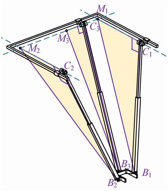 When the mechanism is not in its initial configuration, as shown in Figure 7, the figure contains three right-angled triangles—C1M1B1, C2M2B2, and C3M3B3—which represent the fundamental geometric constraints of the mechanism. These constraints ensure precise positioning and accurate motion trajectories during the movement of the mechanism. The geometric relationships of each triangle are defined by constraint equations (such as Equation (9)), ensuring coordinated motion among different components. Even in certain special cases (e.g., when points C3 and M3 coincide or when points C1 and C2 coincide with M1 and M2), these constraints remain valid, thereby guaranteeing the stability and operability of the mechanism under various working conditions. , , . Therefore, the triangles labeled , , and in the figure are all right triangles.