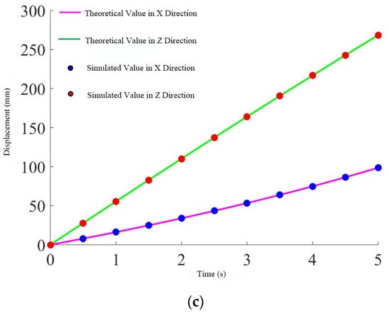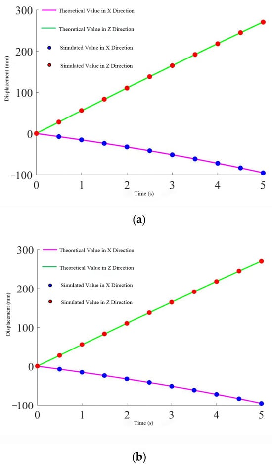 After importing the software model into Adams and adding the corresponding constraints, the initial position of the mechanism needs to be determined. Here, the coordinate origin of the moving platform is set to . A continuous motion is assigned to the moving platform, causing it to move upward along the axis at a constant speed of 300 mm over 5 s. Since Adams software can only measure the changes in the components of the three driving joints along the X, Y, and Z axes during this process, the length changes of the three driving branches need to be calculated using the inverse kinematics formula, which requires projection onto the X, Y, and Z axes. Some points during this motion are selected, with one point taken every 0.5 s in chronological order, resulting in 10 discrete points for verification. Then, the two sets of data are compared.