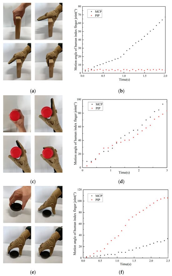 Manual grasp of different objects and joint angle data. (a) Grasp the paper box with a thickness of 35 mm. (b) Joint angle data when grasping the paper box. (c) Grasp the water cup with a diameter of 50 mm. (d) Joint angle data when grasping the water cup. (e) Grasp the plate with a diameter of 80 mm. (f) Joint angle data when grasping the plate.