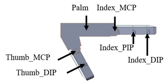 Based on the coupling ratios among the phalangeal joints of human hands when grasping objects, we established a simulation system for grasping prosthetic hands, as shown in Figure 2. It consists of an index finger and a thumb. Each phalanx is designed based on the average finger joint length of a healthy adult. The index finger can adopt the three distinct grasping modes by changing the coupling ratio between the phalangeal joints. The thumb mainly plays an auxiliary role in grasping, using fixed-coupling adaptive mode.