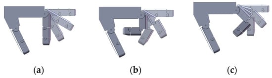 Schematic diagram of grasping a flat object. (a) Uncoupled adaptive mode. (b) Fixed-coupling adaptive mode. (c) Variable-coupling adaptive mode.