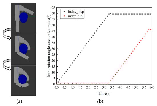 Grasping cylinder in uncoupled mode. (a) Grasping process diagram. (b) Rotation angle data of the index finger’s proximal and distal phalanges.