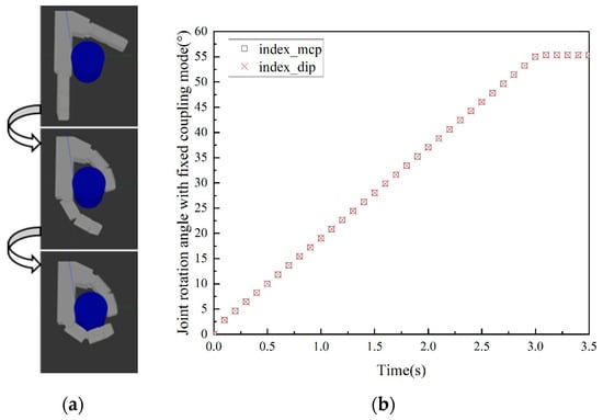 Grasping cylinder in fixed-coupling adaptive mode. (a) Grasping process diagram. (b) Rotation angle data of the index finger’s proximal and distal phalanges.