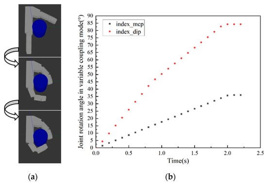 Grasping cylinder in variable-coupling mode. (a) Grasping process diagram. (b) Rotation angle data of the index finger’s proximal and distal phalanges.