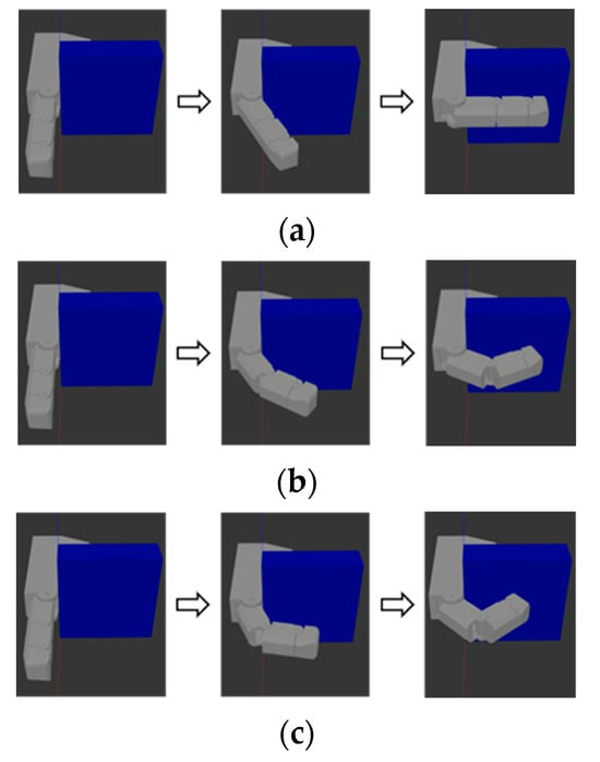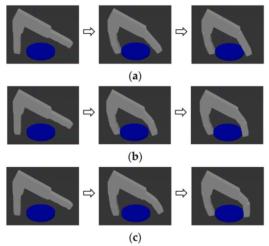 The third object to be grasped is a flat object with a radial size of 50 mm and an axial size of 10 mm, positioned on a table. Its relatively large cross-sectional area makes it suitable for prosthetic hands to perform pinching or claw-like grasps from above. As shown in Figure 8a, in the uncoupled adaptive mode, the distal phalanx initiates movement only after the proximal phalanx contacts the object, which makes it unsuitable for grasping objects with large cross-sectional areas. In the fixed-coupling adaptive mode, the distal phalanx’s contact angle constraints hinder the effective transfer of grasping force to the object’s surface, as depicted in Figure 8b. In the variable-coupling mode, the distal phalanx of the index finger achieves near-vertical contact with the object, as shown in Figure 8c. This allows the driving force to be applied more effectively to the object’s surface, thereby enhancing grasp stability. Driving forces can be applied to the surface more effectively, thus improving grasp stability.