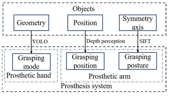 The proposed grasping method requires the prosthetic hand to select the corresponding grasping mode based on the geometric shape of the grasped object. The visual recognition algorithm is introduced in the grasping process to recognize the geometric shape features of the object. The prosthetic hand can choose the grasping mode based on the recognized geometric shape. At the same time, the grasping points and grasping posture corresponding to the prosthetic hand can be reasonably selected by combining the characteristics of the object. The overall structure of the grasp method is shown in Figure 9.