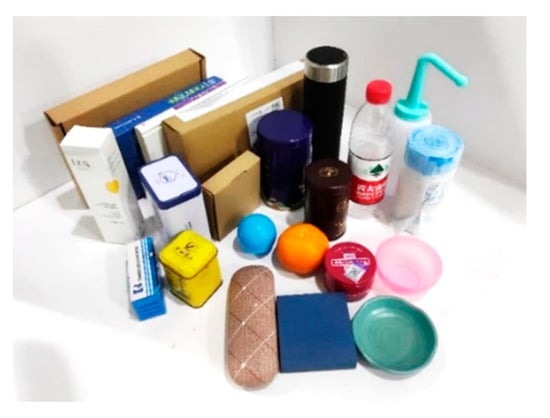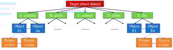 In daily prosthetic hand applications, 22 objects (as shown in Figure 10) are selected to establish a dataset and train the model. A binocular depth camera is mounted on the base via a bracket. The objects are placed at distances between 20 cm and 60 cm from the camera, and over 1000 photos of the 22 objects are collected. Based on the structure shown in Figure 11, a dataset is established using a class-based photo structure. According to the geometric shape of objects, the dataset is divided into five categories.