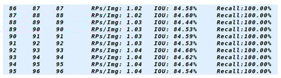 The entire dataset is divided into training and testing sets in a 9:1 ratio. This division can effectively evaluate the accuracy and generalization ability of the model, making the model performance stable and effective. After training, the model is tested, and the results are presented in Figure 12. A total of 96 images were selected for the test, and all the ground truth could be correctly detected. It can be concluded that the IOU reached 84% and the recall reached 100%, indicating that the model has good performance.