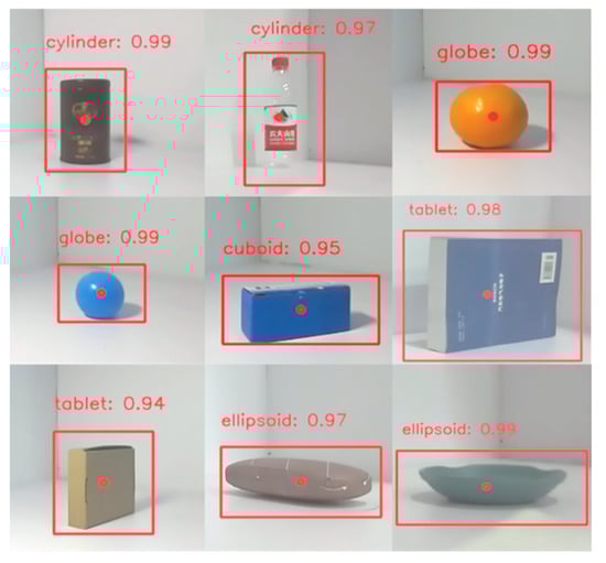 To evaluate the model’s ability to recognize object geometry, several objects with different geometric shapes are selected for testing. Figure 13 displays the model’s geometric shape recognition results along with the corresponding confidence levels for each object. The model not only correctly identified the geometric shapes of all eight objects but also achieved confidence levels of 0.94 or higher for each. In addition, tests show that the model can recognize the shape of objects in under one second. These results demonstrate that the model can identify object geometry quickly, accurately, and reliably.