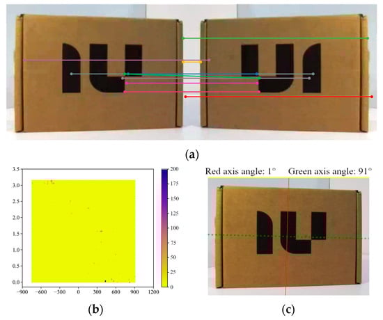 Figure 16. Symmetry axis detection process. (a) The top ten feature point pairs and the endpoints of each line represent a pair of feature points. (b) Hexbin diagram. (c) Symmetry axis detection result of a paper box. - (4)