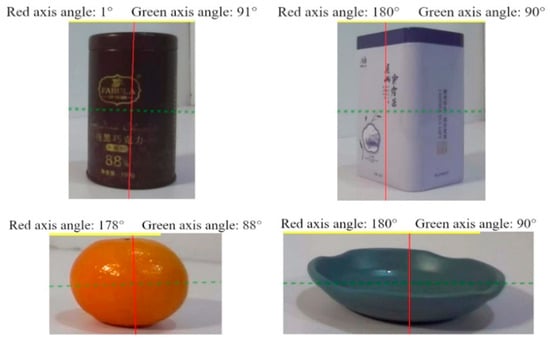 After the above steps, the symmetry axis of the carton can be detected, as shown in Figure 16c. Most objects have a single axis of symmetry. To better determine the prosthetic hand’s posture when grasping objects, the symmetry axis detected by the algorithm is defined as the principal symmetry axis. Based on geometric constraints, an auxiliary symmetry axis perpendicular to the principal symmetry axis is drawn at the center of the object image. In Figure 16c, the red axis is the symmetry axis detected by the algorithm, and the green axis is the symmetry axis drawn according to the geometric relationship. The angle between the axis and the image border is also displayed, clockwise is positive.