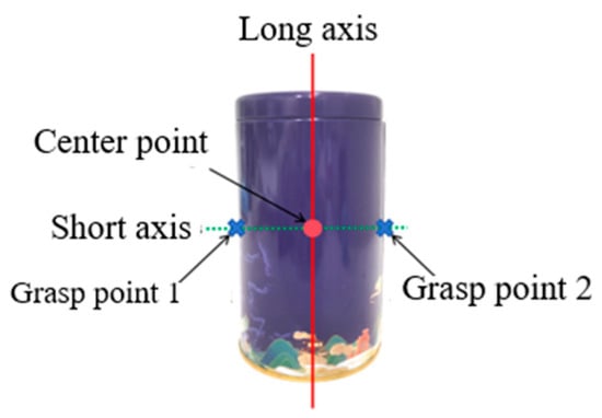 The selection of grasping points significantly affects the success rate and stability of the grasp. For example, when grasping a cylindrical metal can, as shown in Figure 18, its geometric shape can be identified as a cylinder. According to Table 1, the appropriate grasping mode is determined to be the fixed-coupling adaptive mode. The center coordinates of the object can be obtained from the three-dimensional point cloud. Using the previously mentioned method to determine the grasping posture, it is clear that the cylindrical metal can should be grasped along its short axis.