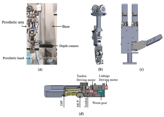 The grasping experimental platform incorporates an anthropomorphic 7-DOF prosthetic arm, a multi-mode prosthetic hand, and a binocular depth camera, as shown in Figure 19a. The prosthetic arm is a 7-DoF upper limb prosthetic experimental platform developed in the laboratory, and its main structure is similar to that of a human arm, as shown in Figure 19b. It consists of the shoulder joint, upper arm, elbow joint, forearm, wrist joint, and other parts, with 2-DoF at the shoulder joint and the wrist joint, respectively, and 3-DoF at the elbow joint. For its control strategies, dynamic modeling, trajectory planning, and trajectory tracking implementation refer to Reference []. The prosthetic hand design employs a hybrid transmission mechanism integrating linkages and tendon-driven systems. Micro-motors dynamically regulate tendon lengths and tension states to modulate interphalangeal coupling ratios. It can implement the three grasping modes proposed in the previous article. The model is shown in Figure 19c, and its grasp ability and control method can be referred to in reference []. Additionally, the internal three-dimensional structure of the finger is shown in Figure 19d. The depth camera is ZED2 from STEREOLABS, which has a resolution of 2K and a frame rate of up to 100 FPS.