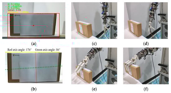 Action flow when grasping a cardboard box with a thickness of 58 mm. (a) Geometric shape and position recognition results and confidence level of the cardboard box. (b) Symmetrical axis detection results of the cardboard box. (c) Initialization of prosthetic arm and prosthetic hand. (d) Movement of the prosthetic arm to the designated position based on hand-eye calibration results. (e) The prosthetic arm moves to the grasp point. (f) According to the mapping relationship of grasping modes, select the uncoupled mode to grasp the cardboard box and lift it.