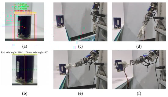Action flow when grasping a cylindrical metal can with a diameter of 80 mm. (a) Geometric shape and position recognition results and confidence level of the metal can. (b) Symmetrical axis detection results of the metal can. (c) Initialization of prosthetic arm and prosthetic hand. (d) Movement of the prosthetic arm to the designated position based on hand-eye calibration results. (e) The prosthetic arm moves to the grasp point. (f) According to the mapping relationship of grasping modes, select the uncoupled mode to grasp the metal can and lift it.