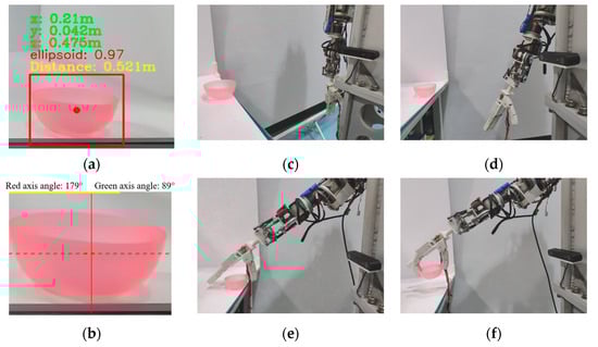 Action flow when grasping a plastic bowl with a size of 88 × 55 mm. (a) Geometric shape and position recognition results and confidence level of the plastic bowl. (b) Symmetrical axis detection results of the plastic bowl. (c) Initialization of prosthetic arm and prosthetic hand. (d) Movement of the prosthetic arm to the designated position based on hand-eye calibration results. (e) The prosthetic arm moves to the grasp point. (f) According to the mapping relationship of grasping modes, select the uncoupled mode to grasp the plastic bowl and lift it.