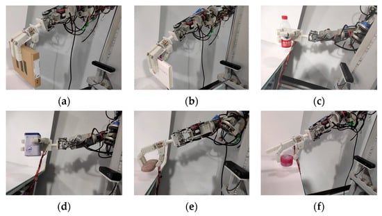 Experimental results of grasping various objects. (a,b) Uncoupled adaptive mode grasping tablet objects. (c,d) Fixed-coupling adaptive mode grasping cylindrical and rectangular objects. (e,f) Variable-coupling adaptive mode grasping flat objects.
