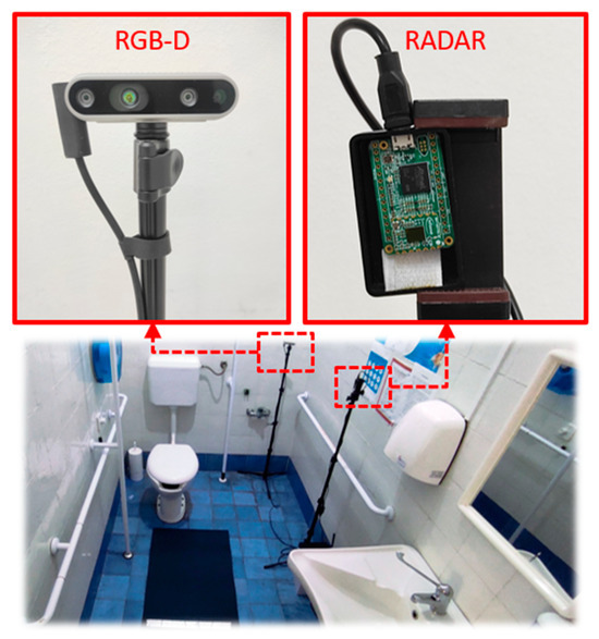 Radar sensor and RGB-D camera mounted on tripods in a bathroom setup including a toilet, sink, and shower.