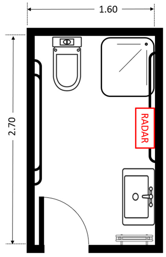 The radar sensor was positioned at a height of 127 cm from the floor using a tripod. The distance between the sensor and the participant ranged from 1.0 m to 2.5 m. The data collection took place in a controlled bathroom environment, as illustrated in Figure 1. The floor plan of the reference bathroom environment used during data collection is shown in Figure 2.