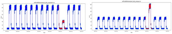Figure 1 illustrates the signals with red samples highlighted to show the section of the signal regarding the anomalies. This figure consists of three types of artificial anomalies (jumps-up, jumps-down, no-jump), one type of AWS, one type of Tweets, and one sort of KnownCause. The number of time samples and number of anomalies corresponding to 14 types of signals can be seen in Table 1. This table explains the number of anomalies, the time samples, the train length, and the test length considered to analyze each signal of this database.