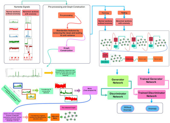 The schematic overview of the proposed method is represented in Figure 3. The Numenta signals are used as the database, and there are sections of signals with an anomaly that can be detected through this procedure. As can be seen in this figure, after the pre-processing and graph construction stage, the obtained graph would be imposed onto the proposed Cheb-MA to perform the training. The Cheb-MA consists of two parts of deep networks. The Cheb part consists of three Chebyshev convolution layers, and the output vector is considered to train the generator and discriminator. The training phase of the Cheb-MA is completed with the parts of the signal without an anomaly. The signal with an anomaly in the test phase would be detected with the trained generator and discriminator. The anomaly predictions are according to the predictions of the discriminator.
