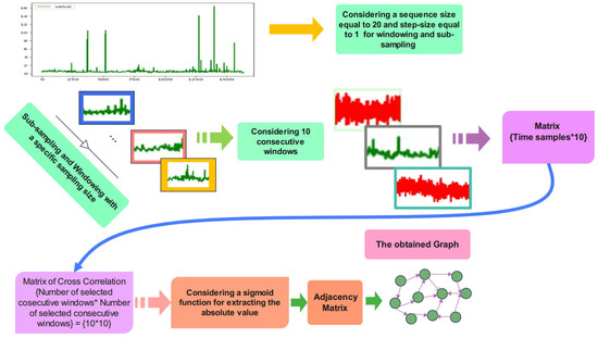 After pre-processing, the graph construction stage is required to impose the constructed graph onto the proposed network architecture. Ten consecutive frames of the sub-sampled signal are required for graph embedding. Cross-correlation between these consecutive signals is calculated to obtain the matrix of cross-correlation. A sigmoid is employed for calculating the absolute value of the cross-correlation matrix. The adjacency matrix is the output of the sigmoid function according to the schematic overview of the graph construction stage in Figure 2.