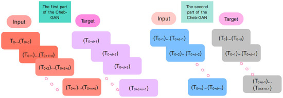 In the training phase, the input and target samples are created according to Figure 5. Input time series for the Chebyshev convolution network of the Cheb-MA are {T0… Td}, {T1…T1 + d}, {T2… T2 + d}, …, {Tn…Tn + d}, and the corresponding targets are Td + 1, Td + 2, Td + 3, …, Td + n + 1. The input time series for the GAN part of the proposed network are of the form {T0 + 1… Td + 1}, {T2…T2 + d}, {T3… T3 + d}, …., {Tn…Tn + d}, and the corresponding targets are {T0… Td}, {T1…T1 + d}, {T2… T2 + d}, …., {Tn − 1…Tn − 1 + d}.