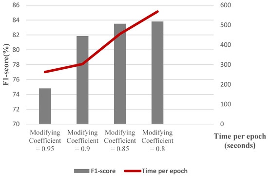 To elaborate more on the effect of different parameters, we conduct a separate experiment. In order to assess the effect of changing the number of Chebyshev layers, a series of simulations are carried out for different numbers of Chebyshev polynomials. Figure 11 demonstrates the results of the simulation for two, three, four, and five Chebyshev layers. Increasing the layers to more than three in this case study does not affect the performance; it causes a computational burden, and it shows the incremental trend of the training time per epoch of the proposed Cheb-MA. Figure 12 shows the comparison result of different modifying coefficients of the adversarial part of the network. This column chart delineates that setting the coefficient equal to 0.9 will improve the F1-score, and it is the efficient one considering the time of convergence. The confusion matrix in accordance with the four types of Numenta signals is illustrated in Figure 13.